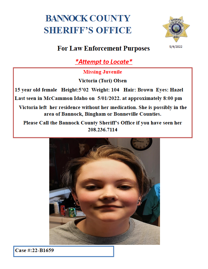 A missing 15-year-old girl from McCammon, Victoria “Tori” Olsen, was found safe. The Bannock County Sheriff’s Office appreciates the public and the media for helping spread the word to help get Tori home safely. The BCSO would also like to thank the Idaho Falls Police Department and Blackfoot Police Department for their cooperation and assistance in this case.