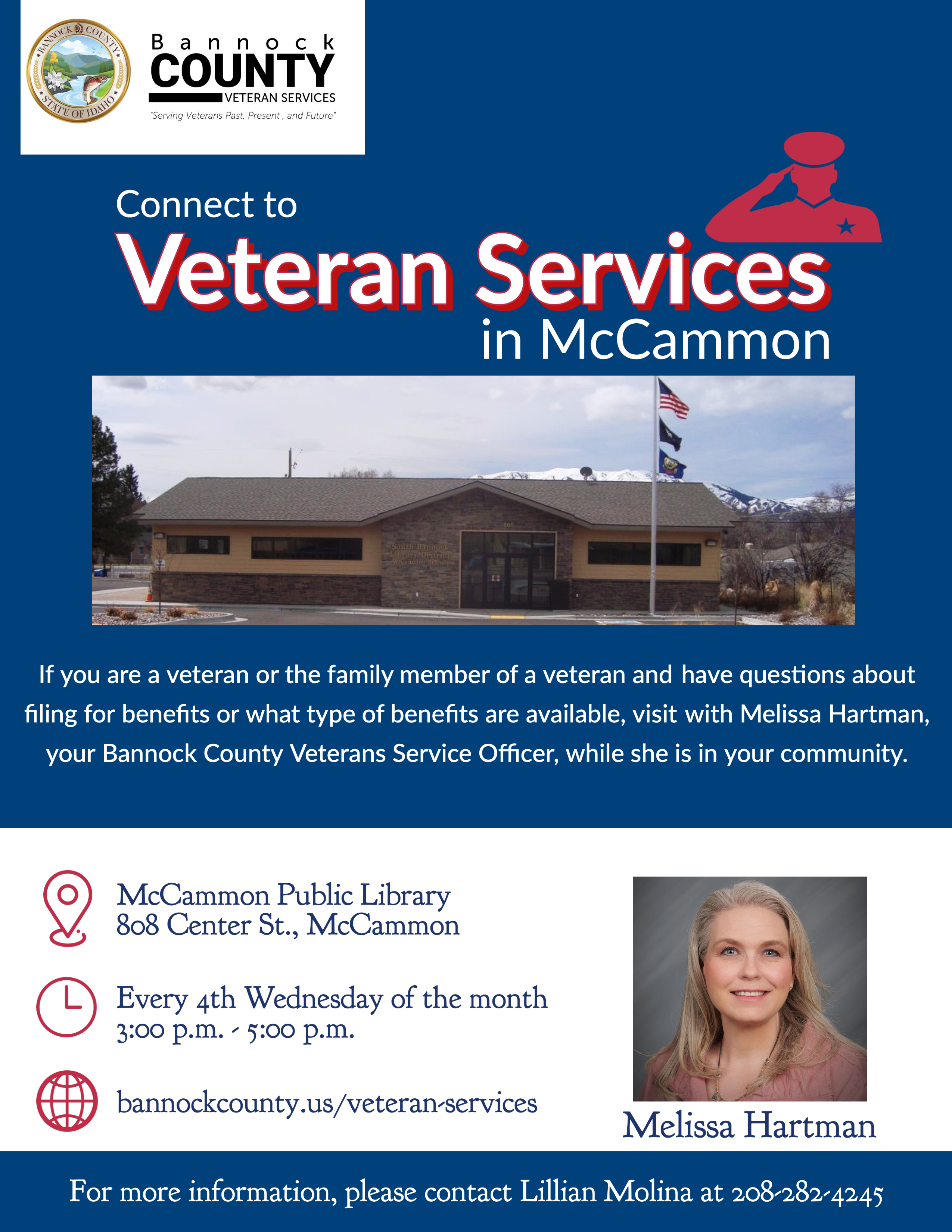 If you are a veteran or the family member of a veteran and have questions about filing for benefits or what type of benefits are available, visit with Melissa Hartman, your Bannock County Veterans Service Officer, while she is in your community.