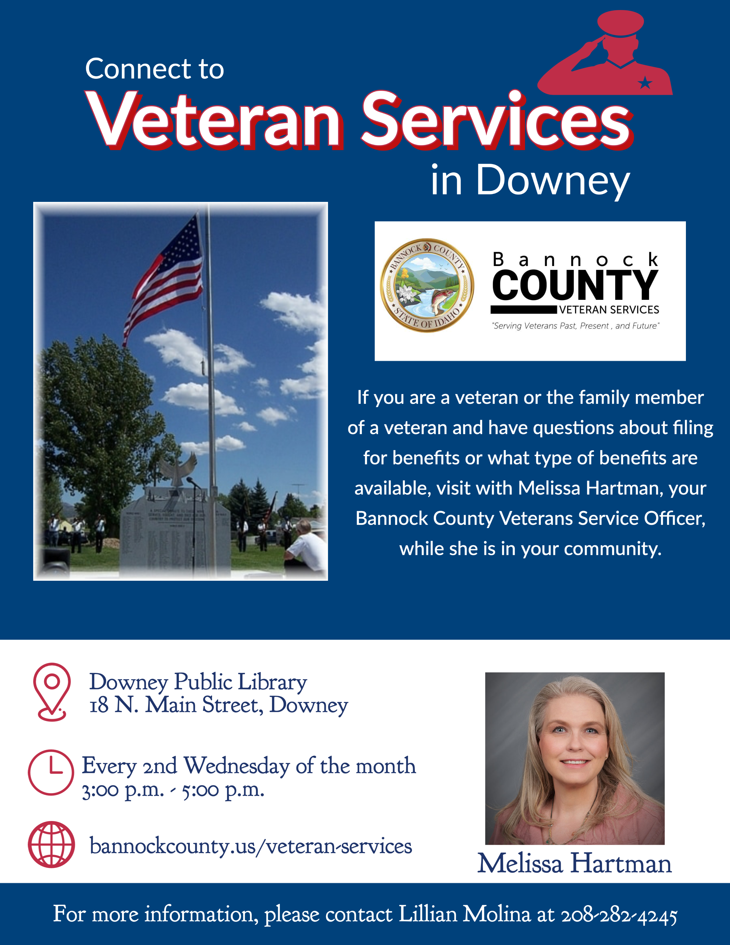 If you are a veteran or the family member of a veteran and have questions about filing for benefits or what type of benefits are available, visit with Melissa Hartman, your Bannock County Veterans Service Officer, while she is in your community.