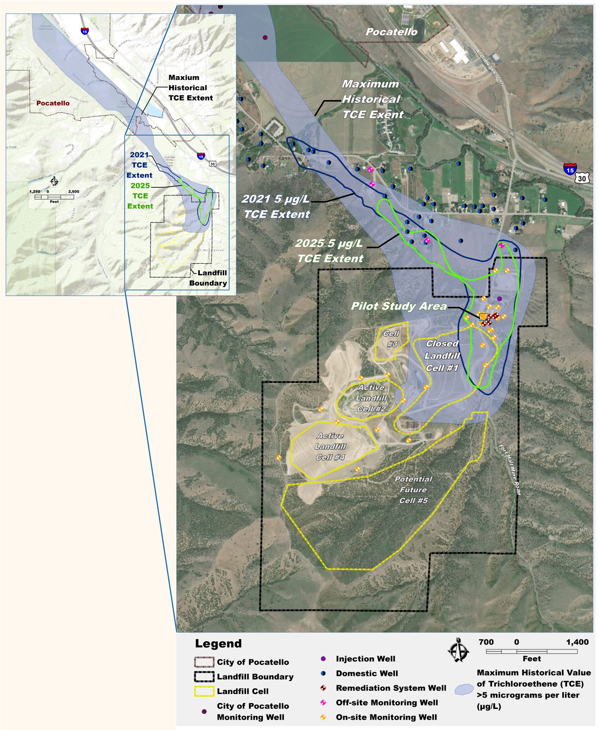- TCE above 5 (µg/L) historically traveled about four and a half miles from the landfill boundary in groundwater to City of Pocatello drinking water supply wells.