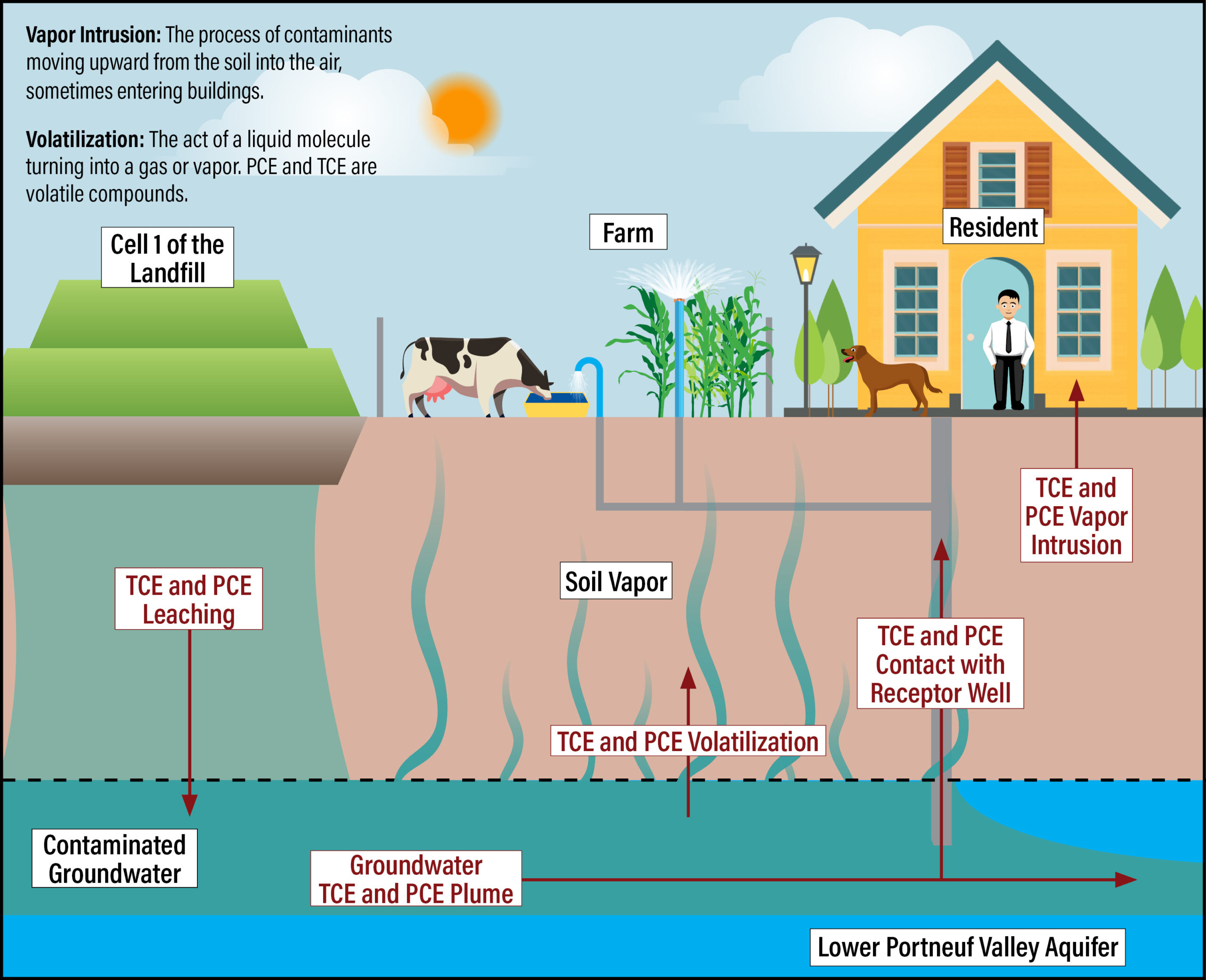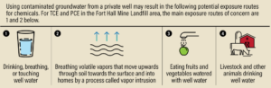 Our risk assessment examined how humans and the environment could be exposed specifically to PCE and TCE, known as exposure routes. Exposure routes of concern for TCE and PCE are: