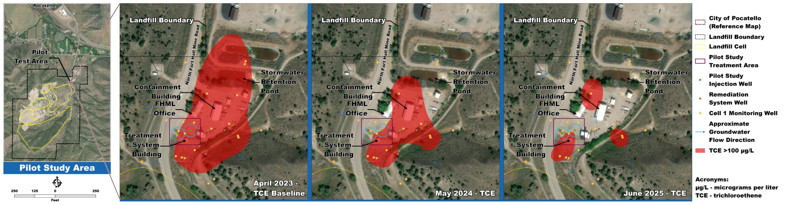 From May 2023 to September 2025, Bannock County sampled nearby wells to check for changes to the groundwater after the first injection test. Groundwater sample results show that the amendment successfully degraded TCE and significantly reduced the contaminant plume and migration of contaminants of the landfill property. TCE concentrations decreased but then increased again in some wells because the pilot test was a small proof-of-concept.