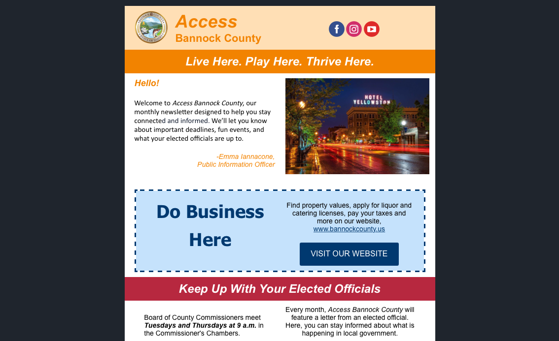 “We’re so excited to launch this as part of our effort to be more transparent and involved in the community. We want Bannock County residents to be connected and engaged with their local government, and this is one of many steps towards that,” said Emma Iannacone, author of the newsletter and Bannock County Public Information Officer.
