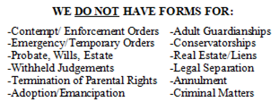 DISCLAIMER: The Court Assistance Office does not represent parties or any of their interests. The Court Assistance Officer may provide services to the opposing parties involved in the case. The information provided is legal information only and is not legal advice. Even if you follow all instructions, you are not guaranteed a favorable result. Please consult with an attorney for legal advice. On this site, we include links to other websites for information purposes only. We do not endorse and are not responsible for the content on external sites.